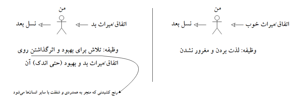 نویسنده در فصل هفتم کتاب، نحوهی برخورد ما با اتفاقات یا میراث خوب/بد را در قالب یک افسانه بیان میکند که به نظر من مطلب جالبی بود و من آن را در نمودار زیر رسم کردهام: (برای بزرگتر شدن تصویر روی آن کلیک کنید.)